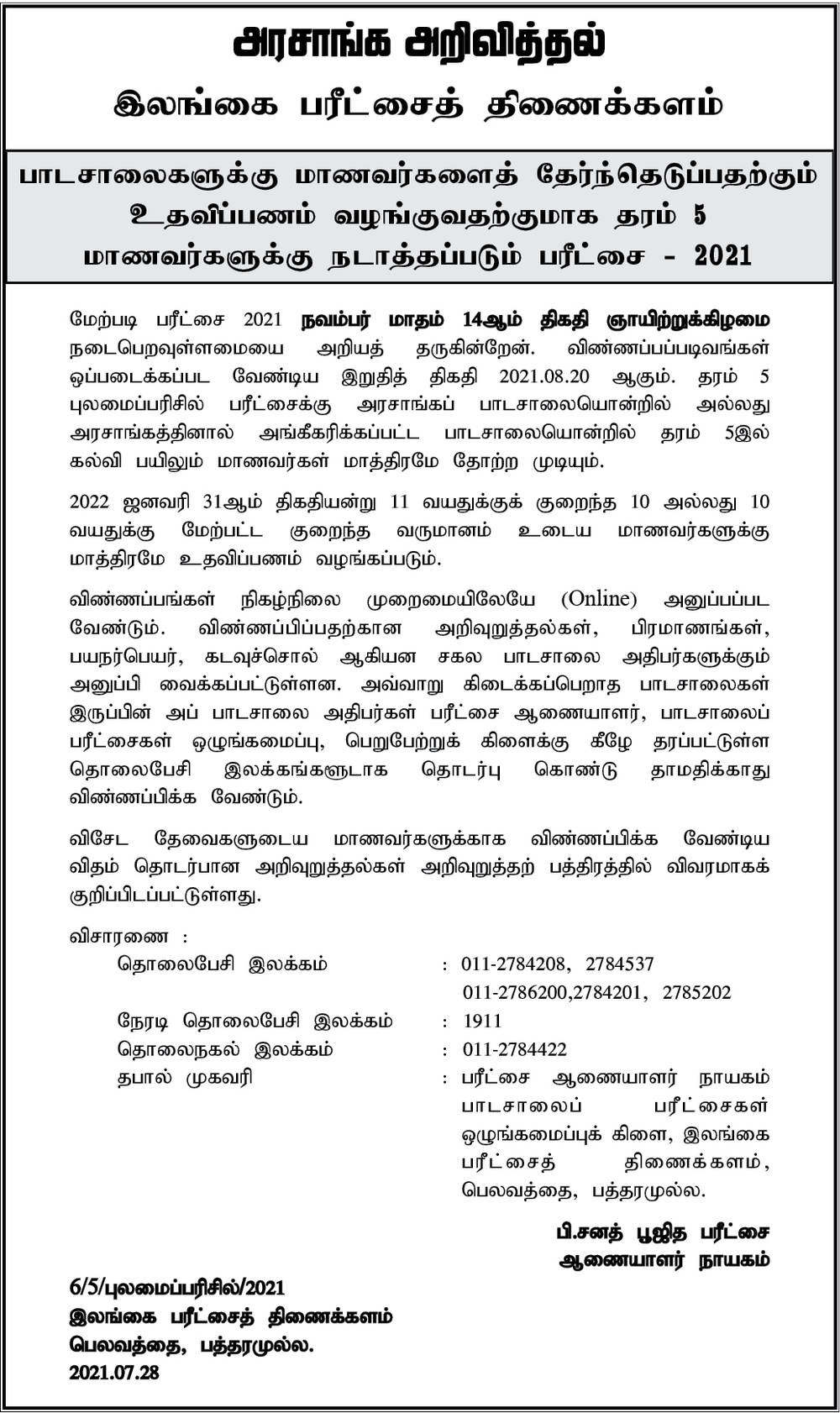Applications Calling for Grade 05 Scholarship Exam 2021 Closing Date Extended