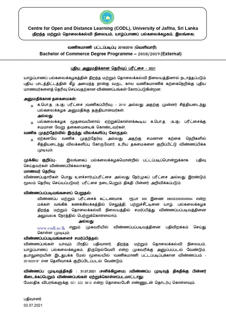 Applications Calling for the B.com External Degree- 2021 by University of Jaffna.