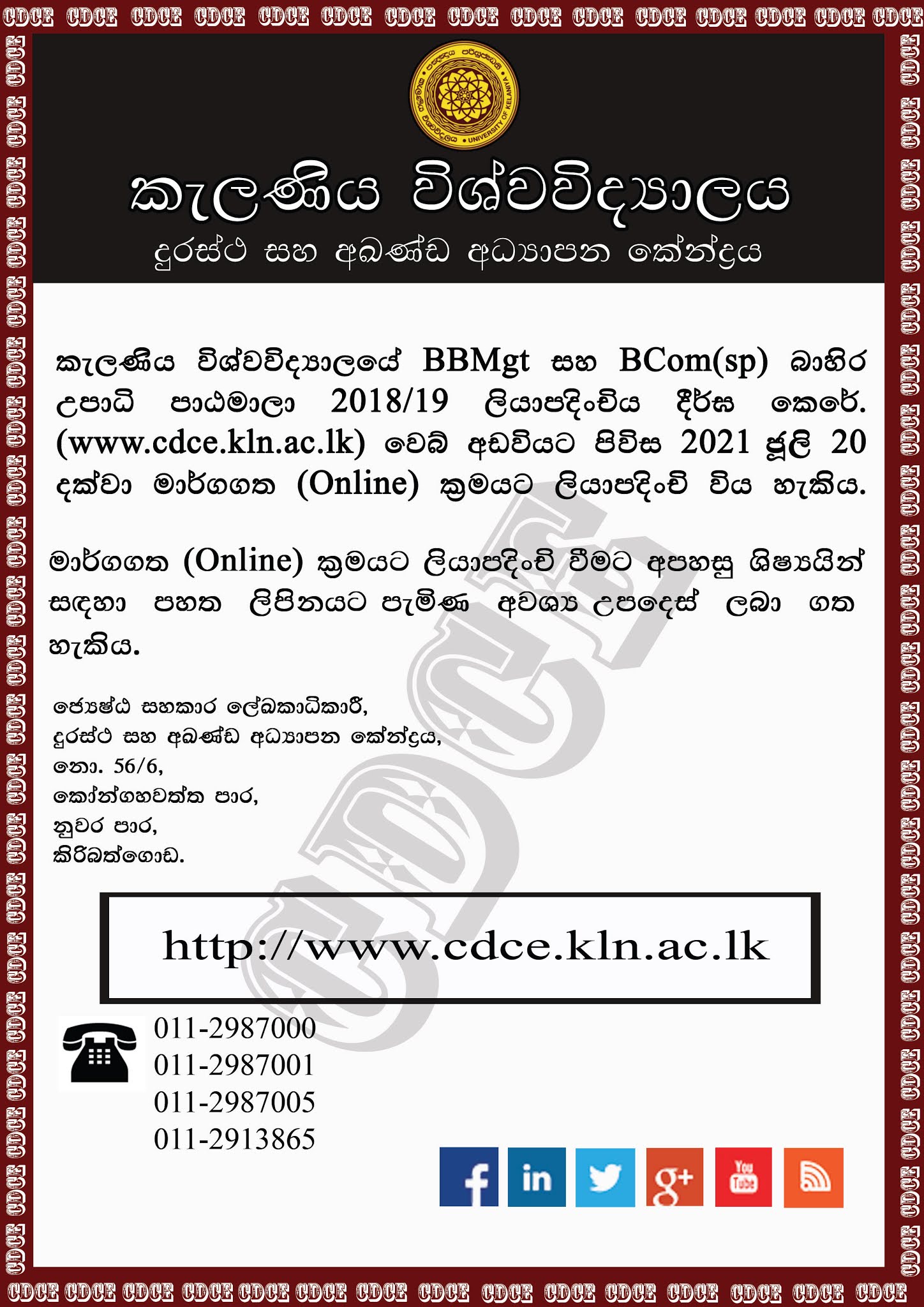 Applications Calling for the Bachelor of Business Administration (General), Bachelor of Commerce (Special) External Degree – 2021 by University of Kelaniya.