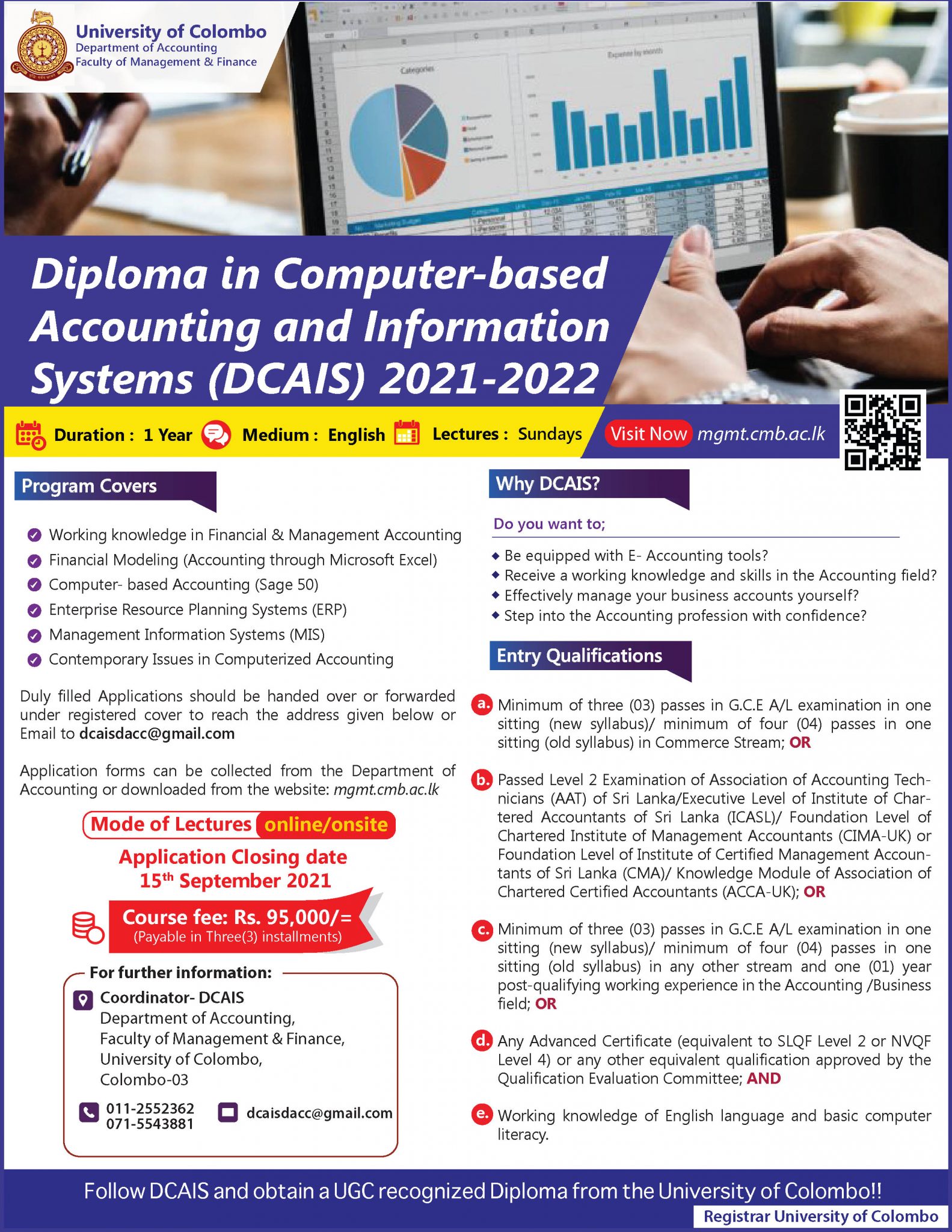 Diploma in Computer – Based Accounting & Information Systems (DCAIS) – 2021 University of Colombo