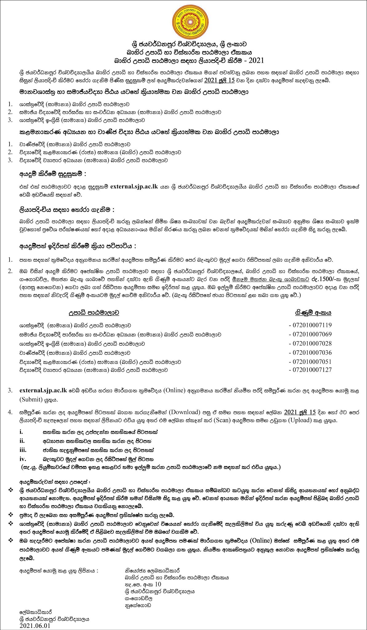 External Degree Programmes – 2021 University of Sri Jayewardenepura
