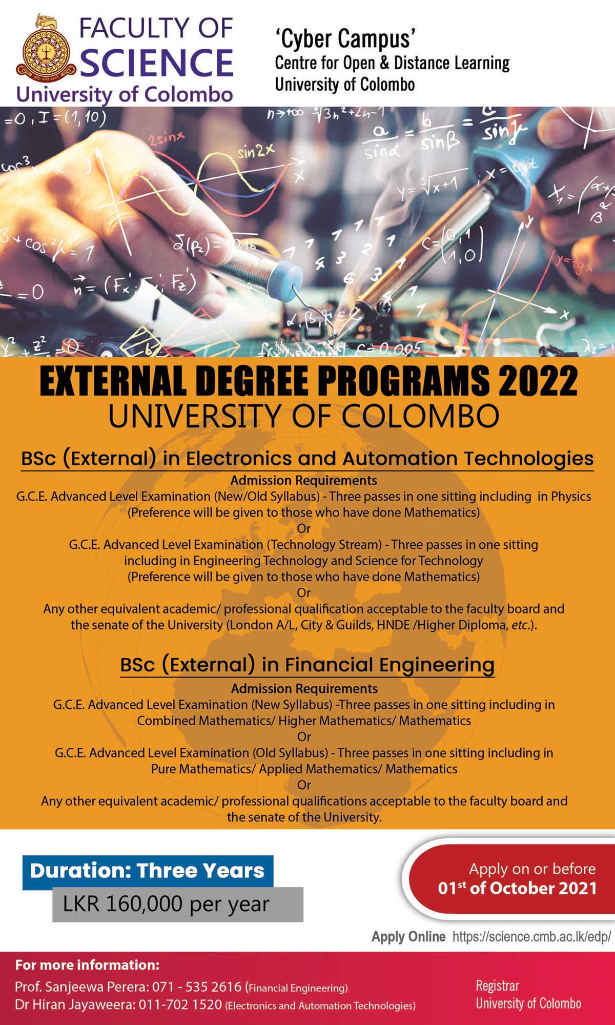 Calling Applications by University of Colombo for the following External Degree Programmes 2022
