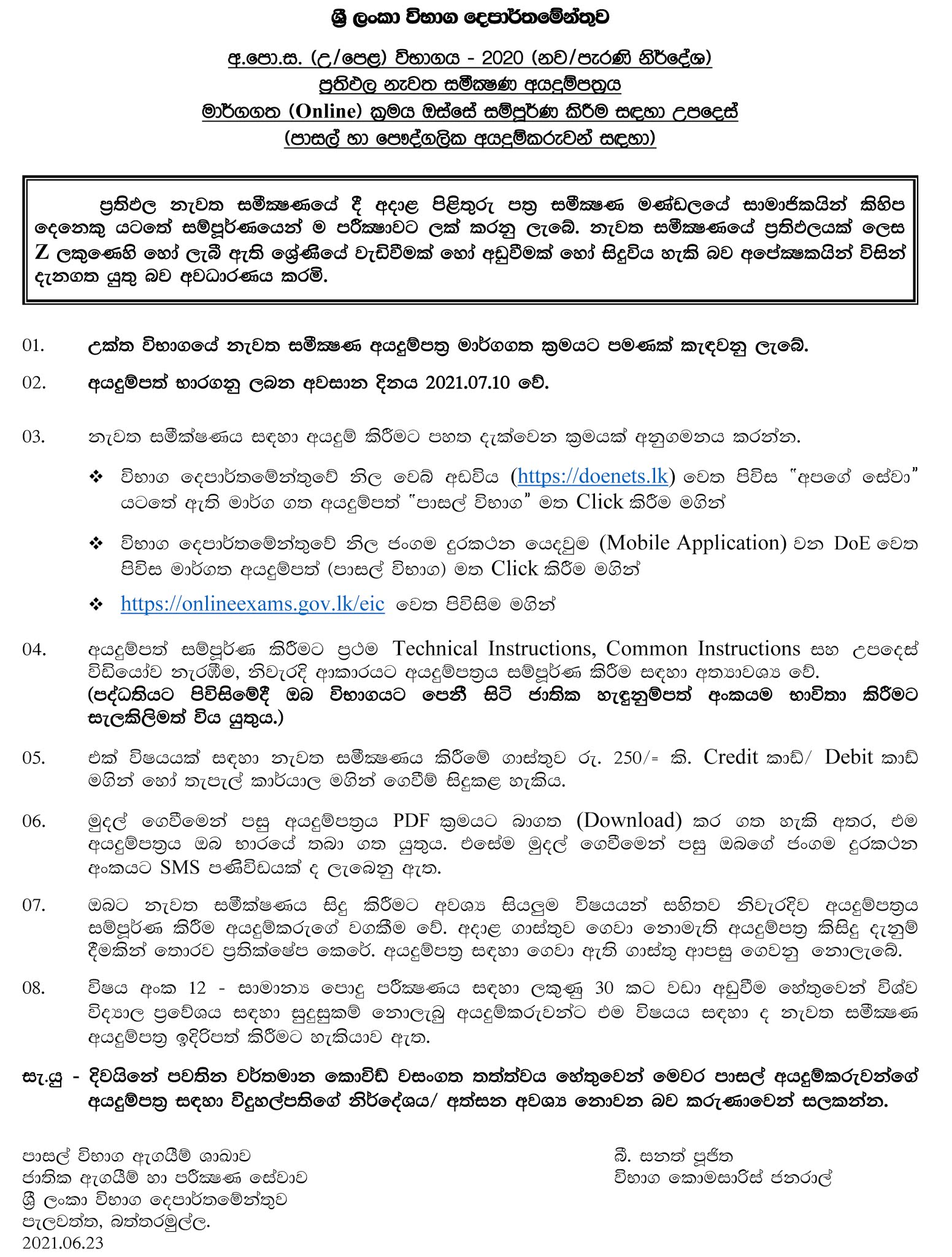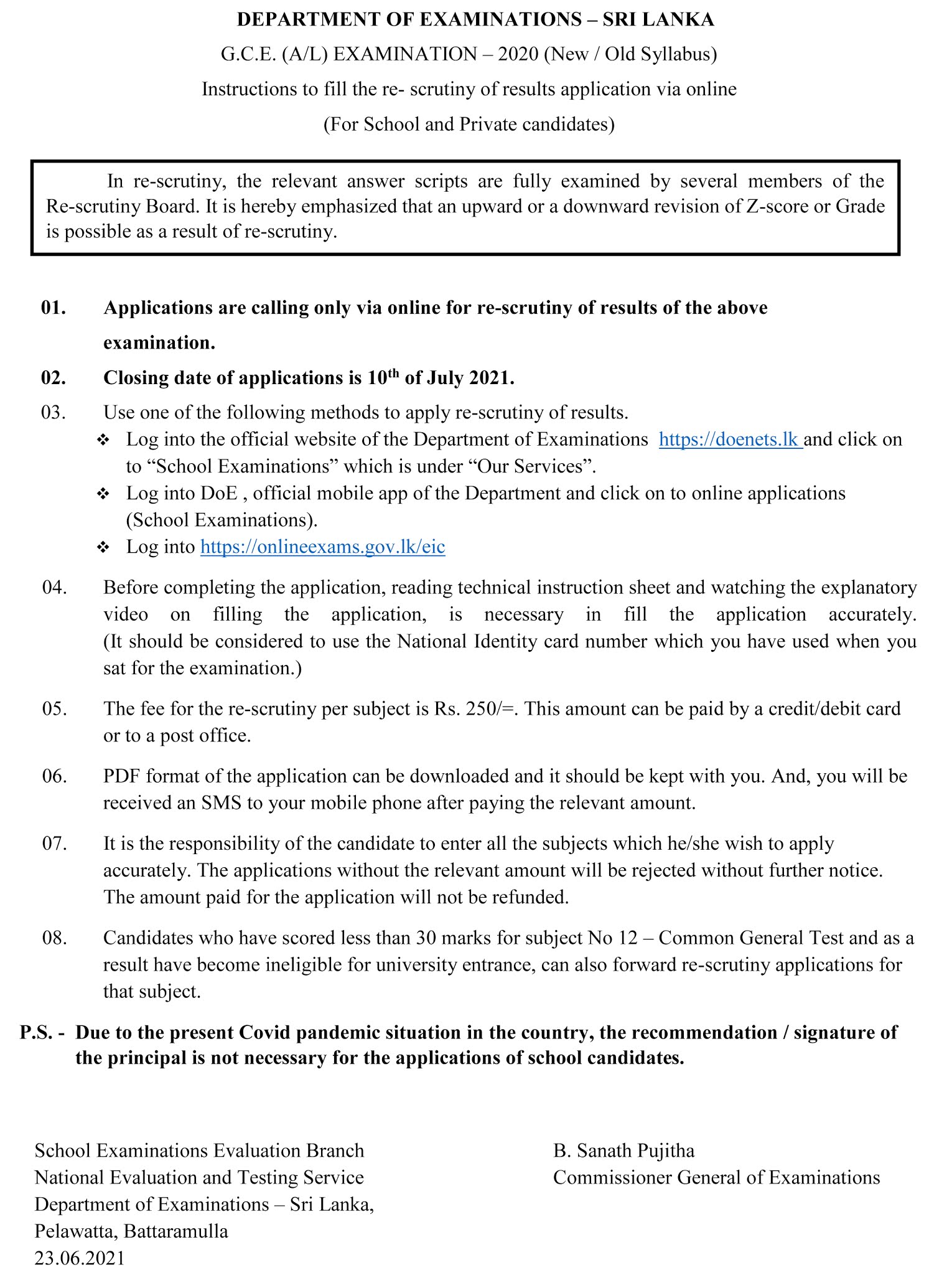 For re-scrutiny of results of G.C.E. (A/L) Examination 2020 can be applied online through https://doenets.lk. from 23rd June 2021. The deadline is 10th July 2021.
