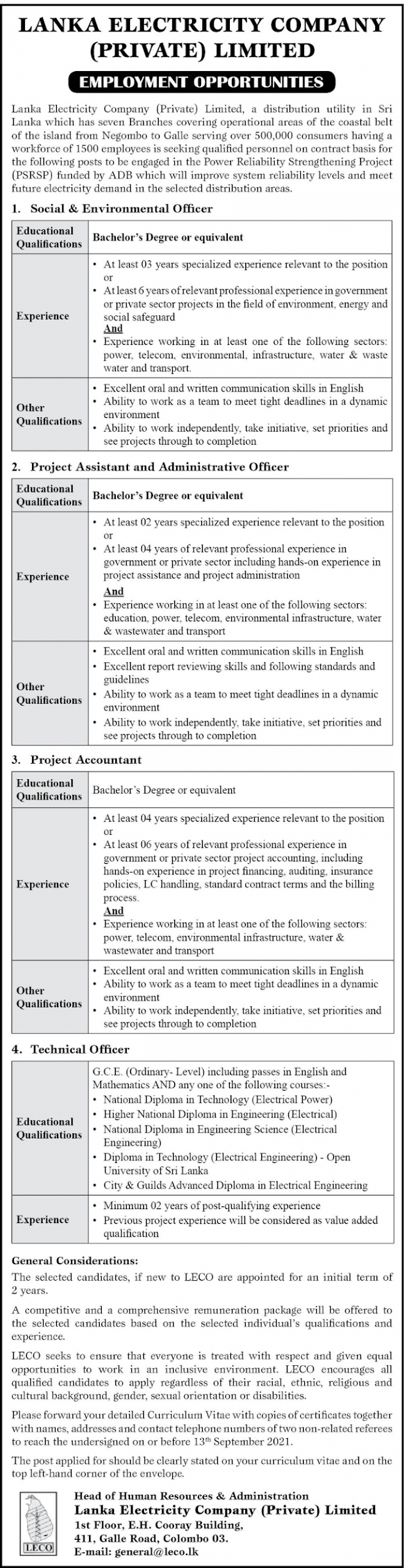 Lanka Electricity Company Private Limited Vacancies – 2021