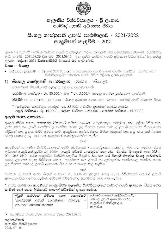 Calling Applications for the Master of Arts (MA) in Sinhala – 2021 Conducted by University of Kelaniya.