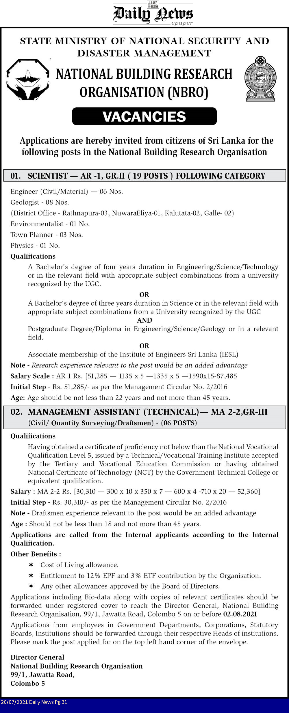 National Building Research Organization (NBRO) Vacancies -2021