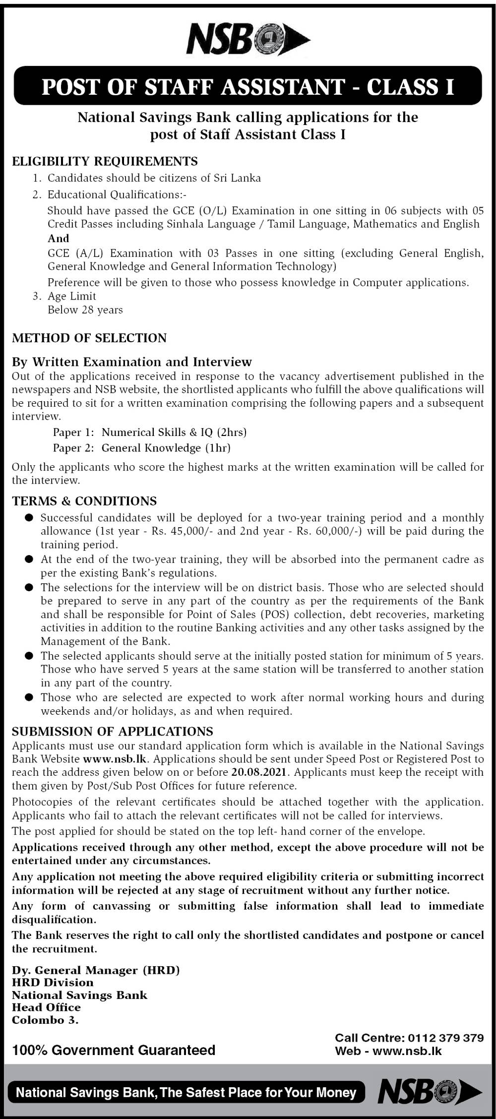 Post of Staff Assistant – Class l National Saving Bank – 2021