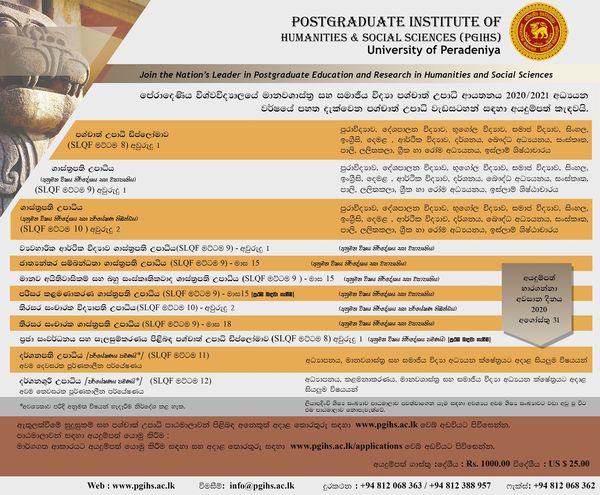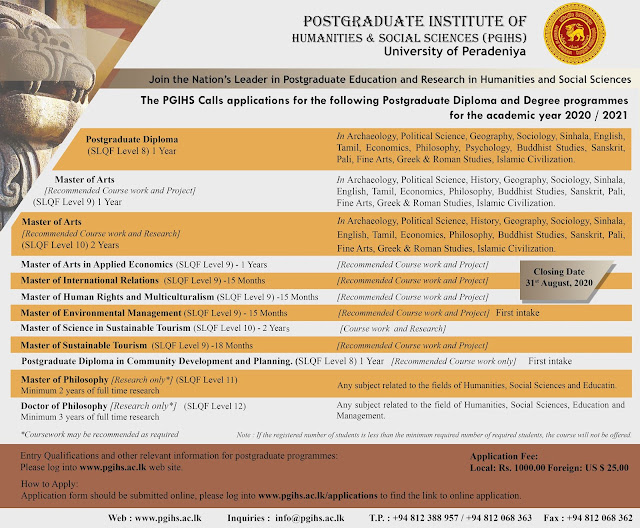 Calling Applications for the Postgraduate Diploma & Degree Programmes 2021/2022 Conducted by University of Peradeniya, Postgraduate Institute of Humanities and Social Science (PGIHS)