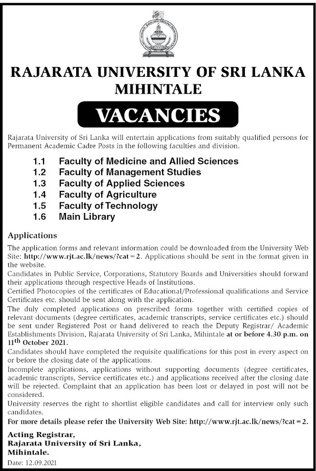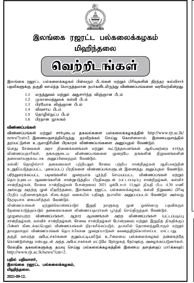 Calling Applications for the following vacancies in Rajarata University of Sri Lanka