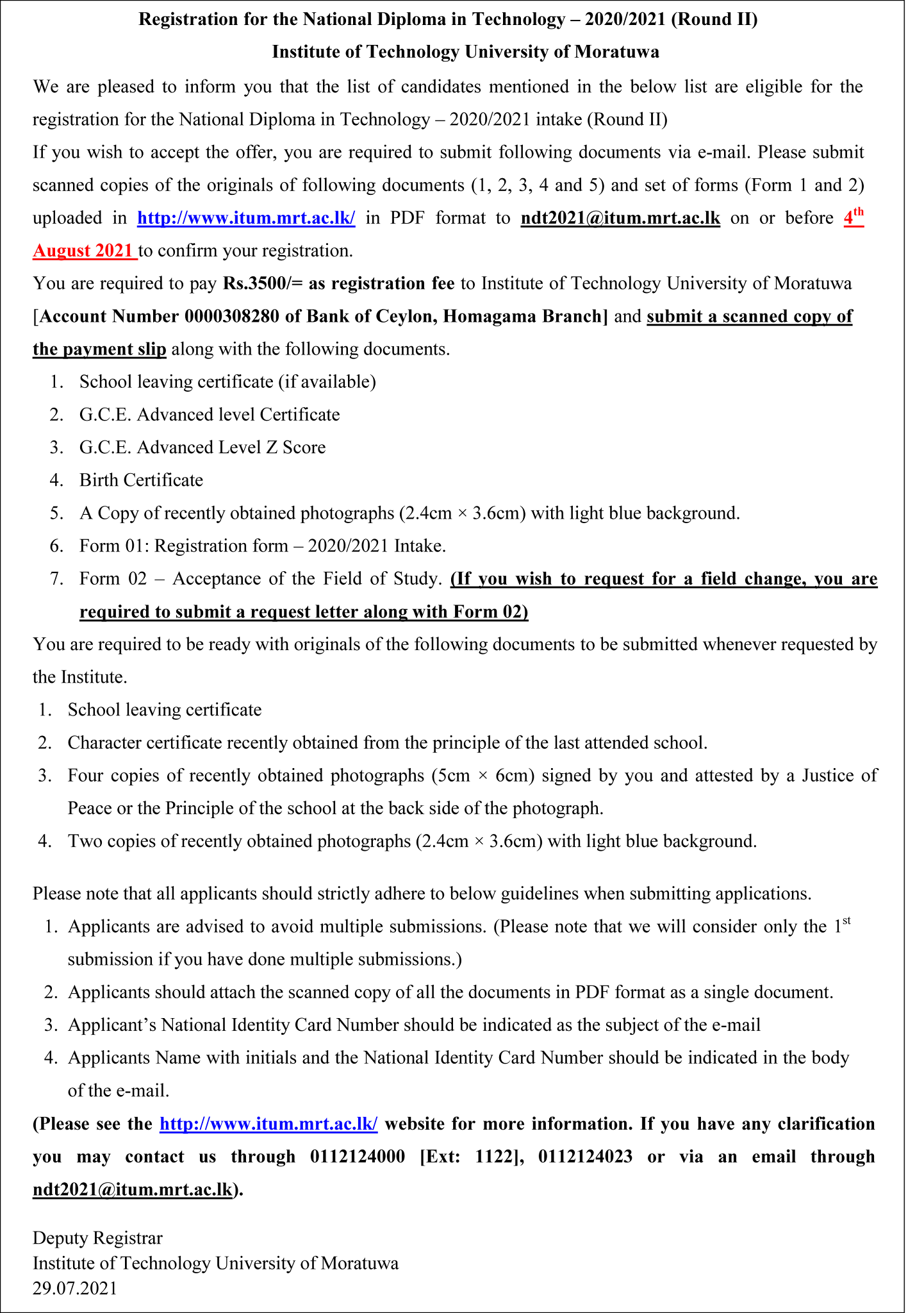 National Diploma in Technology 2020/2021 Batch (Round – 02) Selected list  Released.